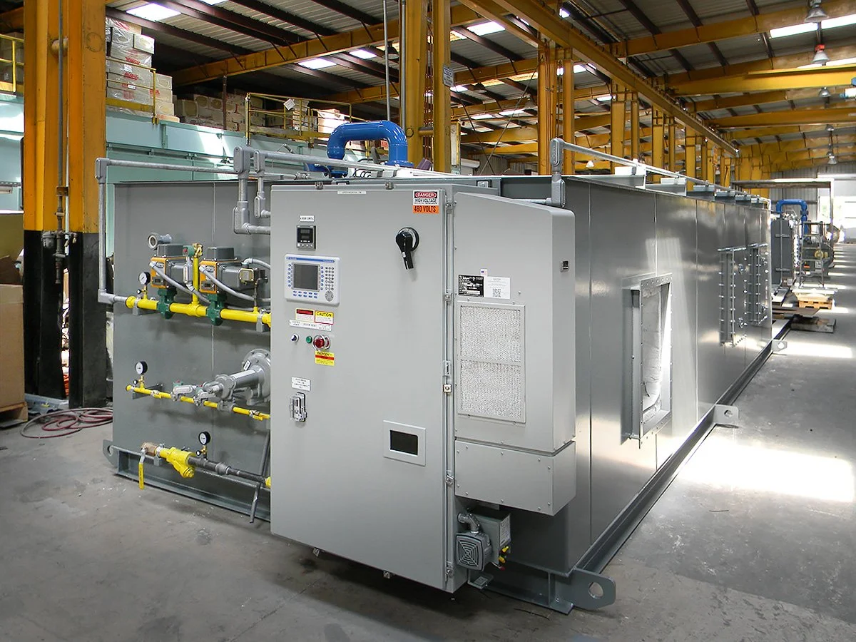 Secondary heat exchange systems use the hot gas from the combustion process to run other processes within the manufacturing facility. There are many different applications for secondary systems. At Epcon we have produced many of these. The most commonly used are Thermal Flued Heaters such as waste heat hot water heaters and boilers, which can be used to heat water for washers, or heating systems within the factory. Another use is process heating, where the air can be used for systems like ovens or other curing devices. These systems are custom, but the general idea remains the same. The gas leaving the oxidizer will generally heat a pre-heat exchanger, then it will continue to the secondary exchanger. The secondary exchanger will use this heat in a manner specified to the particular device, and then will release the air to the atmosphere.